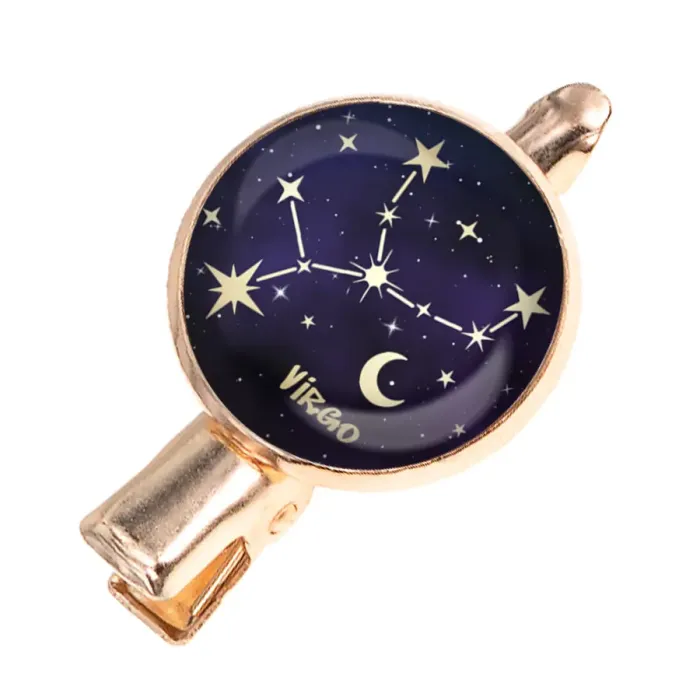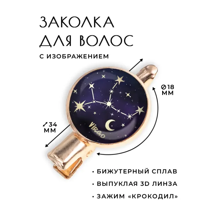 Заколка Знаки Зодиака - Дева представляет собой стильный аксессуар, который не только подчеркивает индивидуальность, но и символизирует черты характера, присущие Девам. Эта заколка выполнена из бижутерного сплава с элегантным покрытием под розовое золото, что придает ей особый шарм.