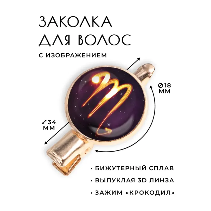 Заколка «Знаки Зодиака - Скорпион» — это стильный аксессуар, который подчеркнёт индивидуальность и добавит изюминку в образ. Изготовленная из бижутерного сплава с покрытием под розовое золото, она сочетает в себе элегантность и прочность. Крокодиловский тип зажима обеспечивает надежное крепление, а защитная выпуклая стеклянная линза придаёт изображению особую выразительность.