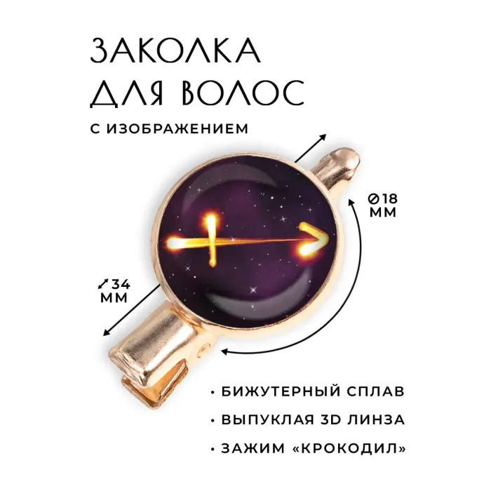 Заколка Знаки Зодиака - Стрелец представляет собой стильный аксессуар, который не только дополняет образ, но и символизирует личные качества людей, рожденных под знаком Стрельца. Изготовленная из бижутерного сплава с покрытием под розовое золото, она привлекает внимание своим элегантным дизайном.