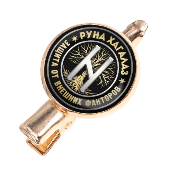 Заколка для волос из бижутерного сплава с изображением руны Хагалаз под стеклянной линзой.