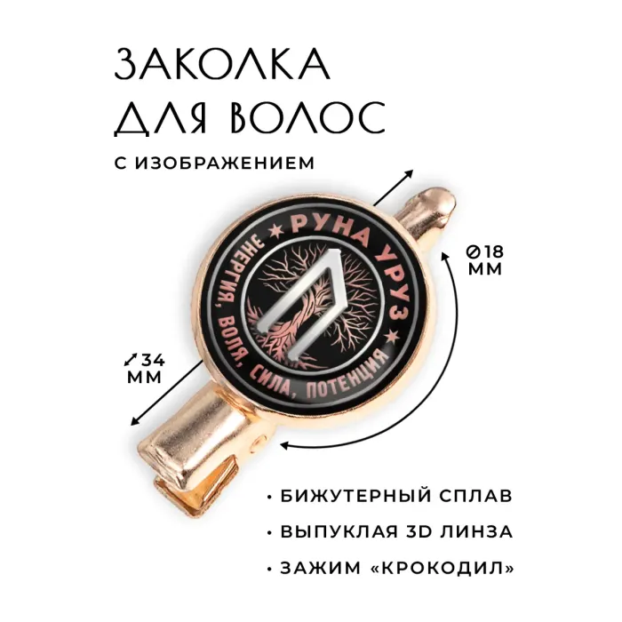 Заколка для волос из бижутерного сплава с покрытием под розовое золото и декором в виде руны Уруз.