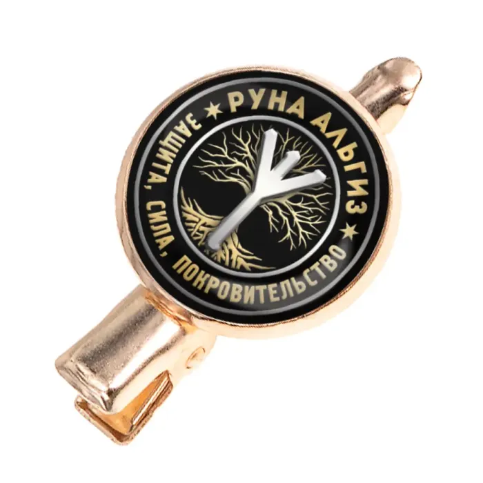 Заколка для волос из бижутерного сплава с покрытием под розовое золото и изображением руны Альгиз под стеклянной линзой.