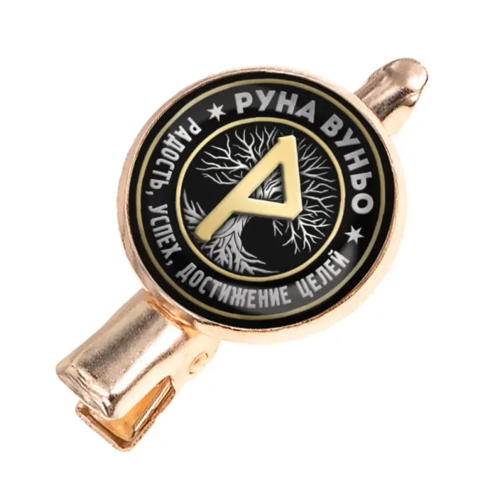 Заколка для волос из бижутерного сплава с изображением руны Вуньо под стеклянной линзой.