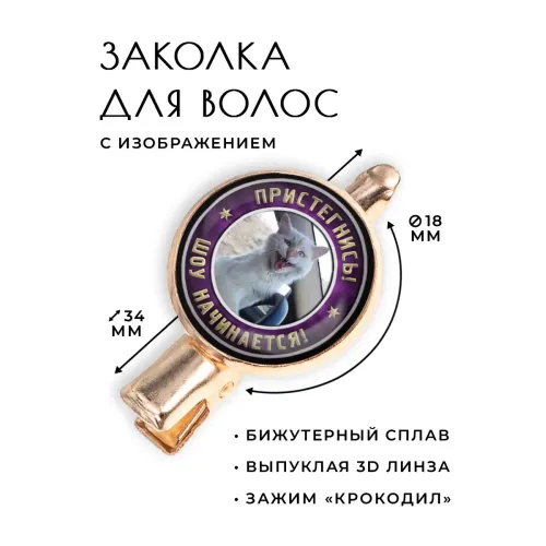Размеры и комплектация: Размеры заколки: 34х20х15 мм, диаметр изображения: 18 мм. Упаковка: прозрачный пакет.