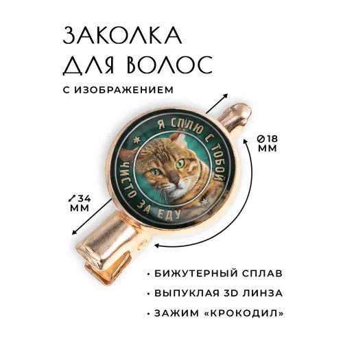Заколка для волос с надписью «Я сплю с тобой за еду». Изготовлена из бижутерного сплава с покрытием под розовое золото, имеет крокодиловидный зажим.