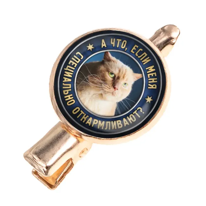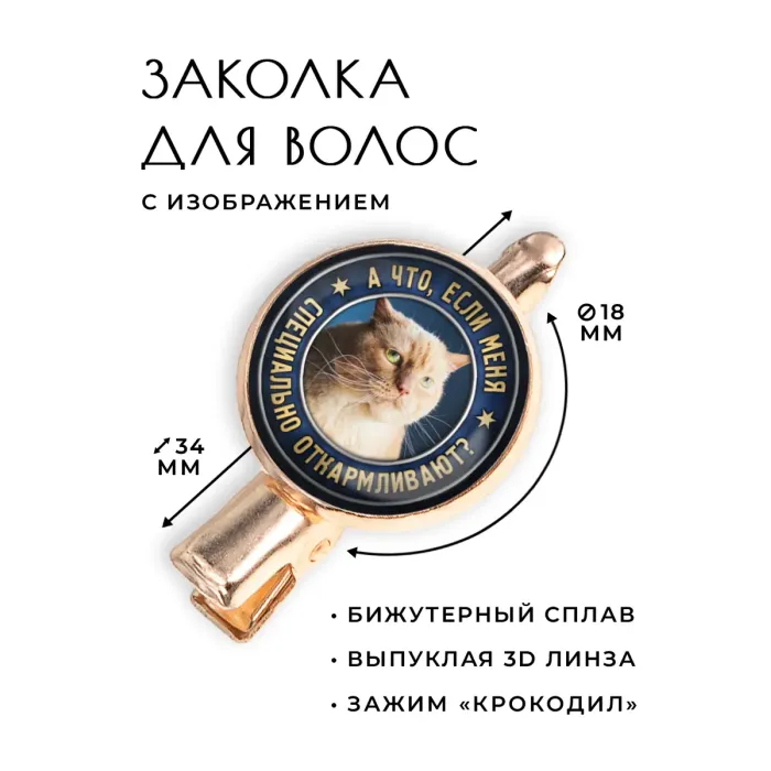 Размеры и комплектация: Размер заколки: 34х20х15 см, диаметр изображения: 18 мм. Тип зажима: крокодил. Упаковка: прозрачный пакет.