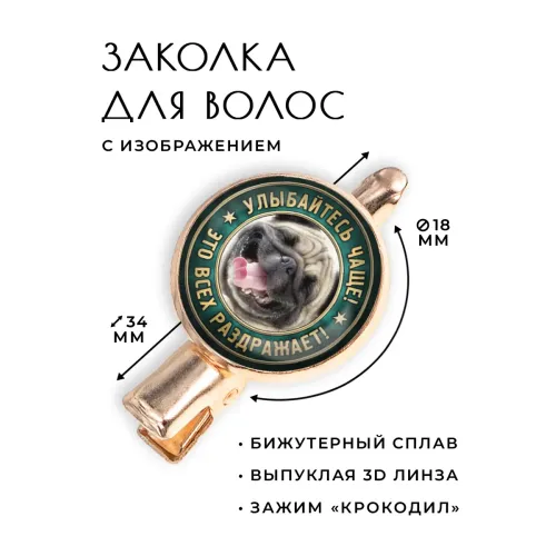 Размеры и комплектация: Размер заколки: 34х20х15 мм, диаметр изображения: 18 мм. Тип зажима: крокодил. Упаковка: прозрачный пакет.