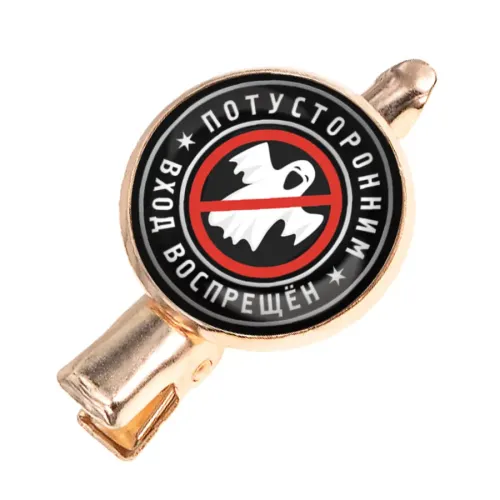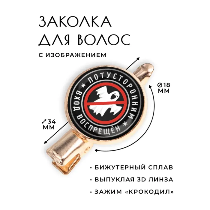 Заколка для волос с изображением и надписью «Потусторонним вход воспрещён». Изготовлена из бижутерного сплава с покрытием под розовое золото, тип зажима — «крокодил».