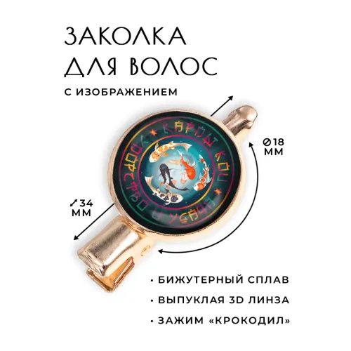 Размеры и комплектация: Размер заколки 34х20х15 мм, диаметр изображения 18 мм. Тип зажима — крокодил. Упаковка — прозрачный пакет.