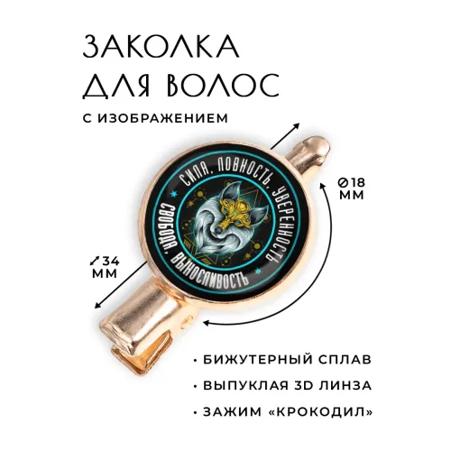 Заколка для волос в виде волка, изготовленная из бижутерного сплава с покрытием под розовое золото. Основной элемент — изображение волка под выпуклой стеклянной линзой, тип зажима — крокодил.