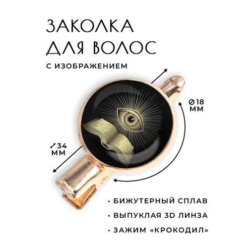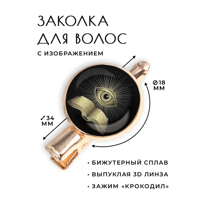 Размеры и комплектация: Размеры заколки: 34х20х15 мм. Диаметр изображения: 18 мм. Тип зажима: крокодил. Упаковка: прозрачный пакет.