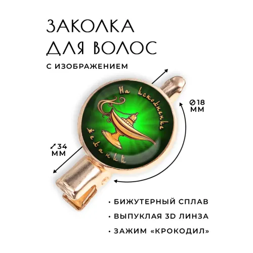 Размеры и комплектация: Размер заколки: 34х20х15 мм, диаметр изображения: 18 мм. Тип зажима: крокодил. Упаковка: прозрачный пакет.
