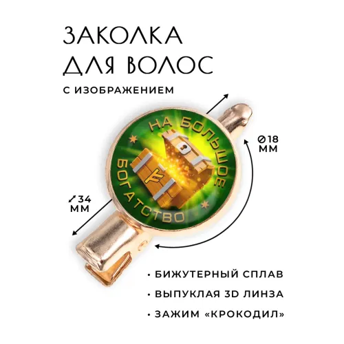 Размеры и комплектация: Размеры заколки: 34х20х15 см, диаметр изображения: 18 мм. Тип зажима: крокодил. Упаковка: прозрачный пакет.