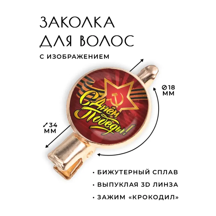 Заколка «С Днём Победы!» — это стильный аксессуар, который станет отличным подарком и символом уважения к памяти героев. Изготовлена из бижутерного сплава с покрытием под розовое золото, она сочетает в себе элегантность и патриотизм.