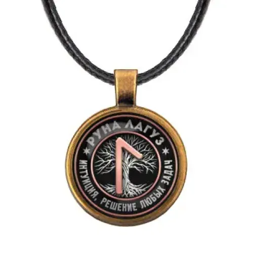 Кулон с изображением руны Лагуз из бижутерного сплава со стеклянной линзой.