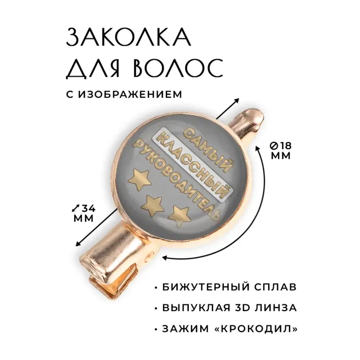 Заколка "Самый классный руководитель" — это стильный аксессуар, который станет отличным подарком для любимого преподавателя. Изготовленная из бижутерного сплава с покрытием под розовое золото, она сочетает в себе элегантность и практичность. Тип зажима — крокодил, что обеспечивает надежное крепление на волосах. Размер заколки составляет 34х20х15 см, а диаметр изображения — 18 мм. Изображение защищено выпуклой стеклянной линзой, что придает изделию дополнительную защиту и блеск. Товар упакован в прозрачный пакет, готовый к вручению.