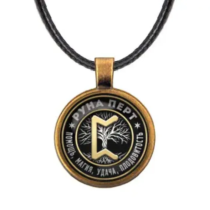Кулон с изображением руны Перт. Изготовлен из бижутерного сплава с покрытием под бронзу, изображение защищено выпуклым стеклом.