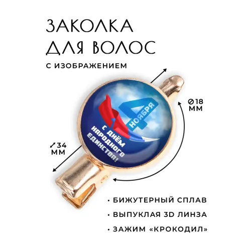 Заколка, посвященная Дню Народного Единства, станет ярким символом единства и сплоченности. Изготовленная из бижутерного сплава с покрытием под розовое золото, она привлекает внимание своим элегантным дизайном. Основные характеристики: тип зажима - крокодил, размеры заколки составляют 34х20х15 см, а диаметр изображения - 18 мм. Изображение защищено выпуклой стеклянной линзой для долговечности и яркости. Упакована в прозрачный пакет, что делает её отличным вариантом для подарка или личного использования.