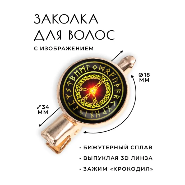 Заколка для волос из бижутерного сплава с покрытием под розовое золото и изображением под выпуклой стеклянной линзой.