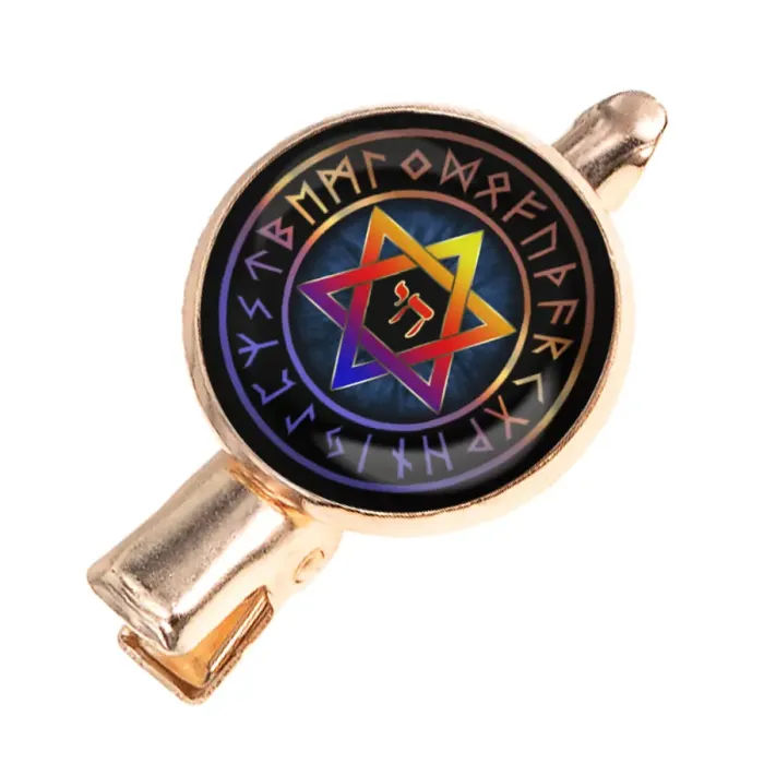 Заколка для волос в форме Звезды Давида из бижутерного сплава с покрытием под розовое золото и стеклянной линзой.