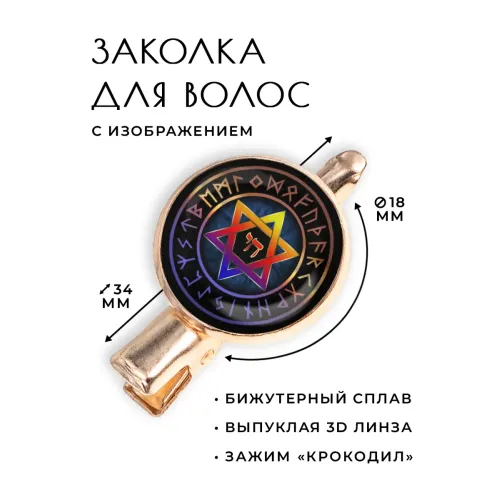 Размеры и комплектация: Размер заколки: 34х20х15 мм, диаметр изображения: 18 мм. Тип зажима: крокодил. Упаковка: прозрачный пакет.