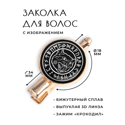 Размеры и комплектация: Размер заколки 34х20х15 см, диаметр изображения 18 мм. Упаковка: прозрачный пакет.