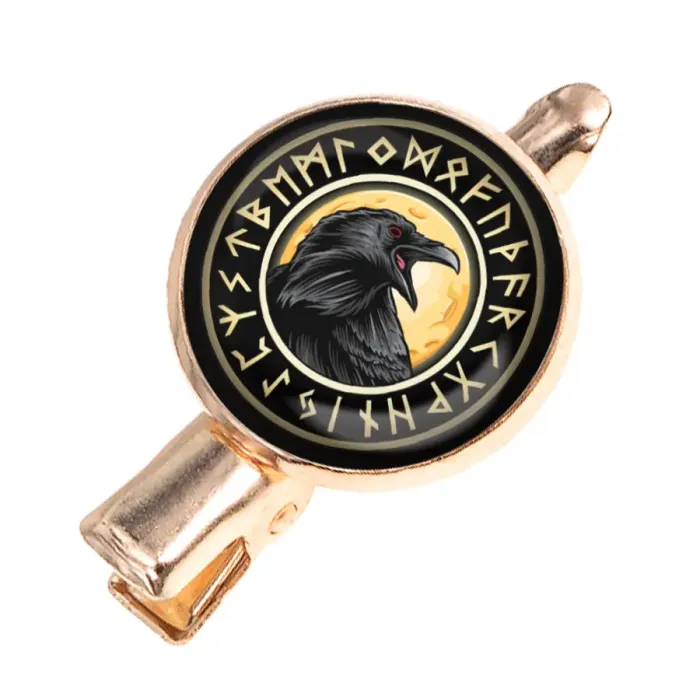 Заколка для волос в виде ворона из бижутерного сплава с покрытием под розовое золото и изображением под стеклянной линзой.