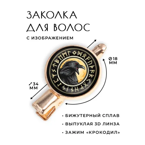 Размеры и комплектация: Размер заколки 34х20х15 мм, диаметр изображения 18 мм. Тип зажима — крокодил. Упаковка — прозрачный пакет.
