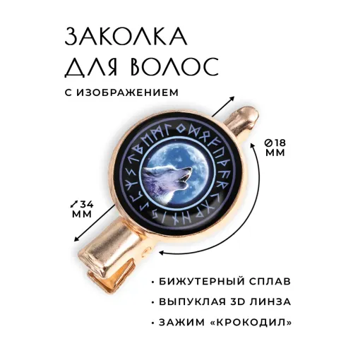 Заколка для волос с изображением волка. Материал — бижутерный сплав с покрытием под розовое золото. Крепление типа «крокодил».
