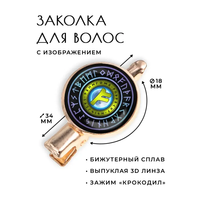 Размеры и комплектация: Размеры заколки: 34х20х15 мм, диаметр изображения — 18 мм. Тип зажима: крокодил. Упаковка: прозрачный пакет.