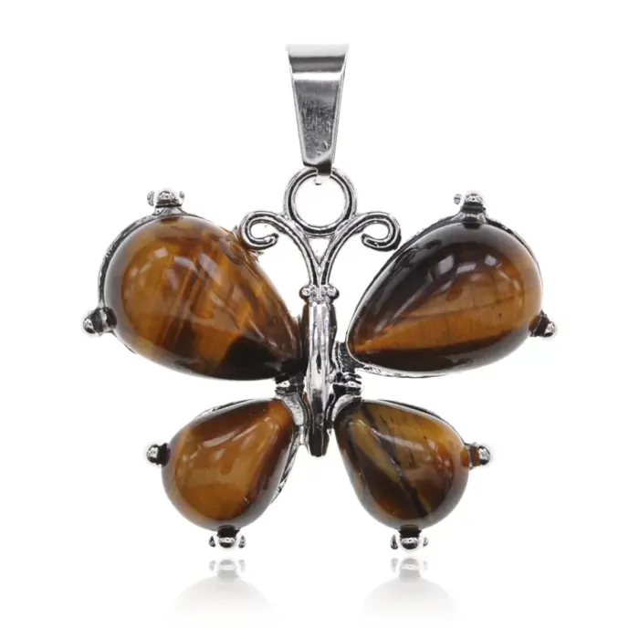 Кулон в форме бабочки из бижутерного сплава с натуральным камнем тигровый глаз.