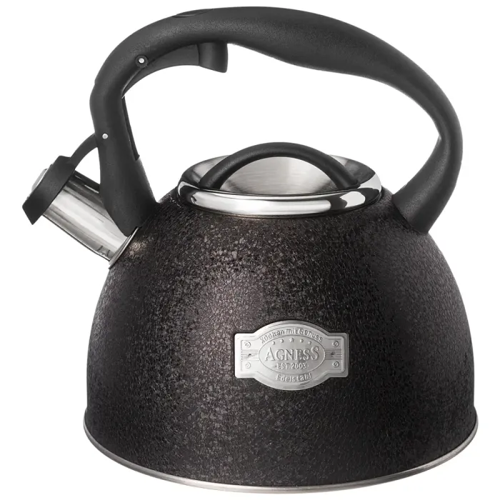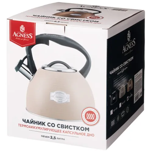 Чайник со свистком Agness объёмом 2,5 литра предназначен для кипячения воды на кухне. Модель выполнена из нержавеющей стали и оснащена индукционным капсульным дном для работы на всех типах плит.