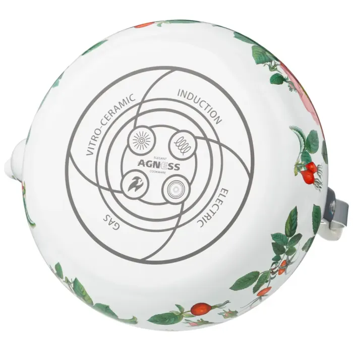 Эмалированный чайник Agness объёмом 2,5 литра предназначен для кипячения воды на кухне. Изготовлен из стали с эмалированным покрытием, которое проходит трёхэтапный обжиг при температуре около 800 °C для сохранения яркости декора.
