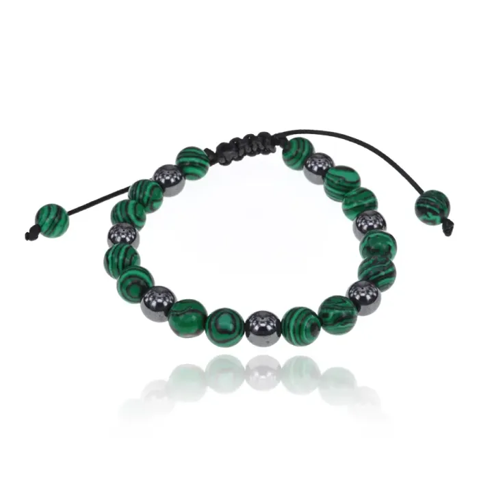 Браслет из бусин синтетического малахита и немагнитного гематита диаметром 8 мм. Регулируется по размеру запястья.