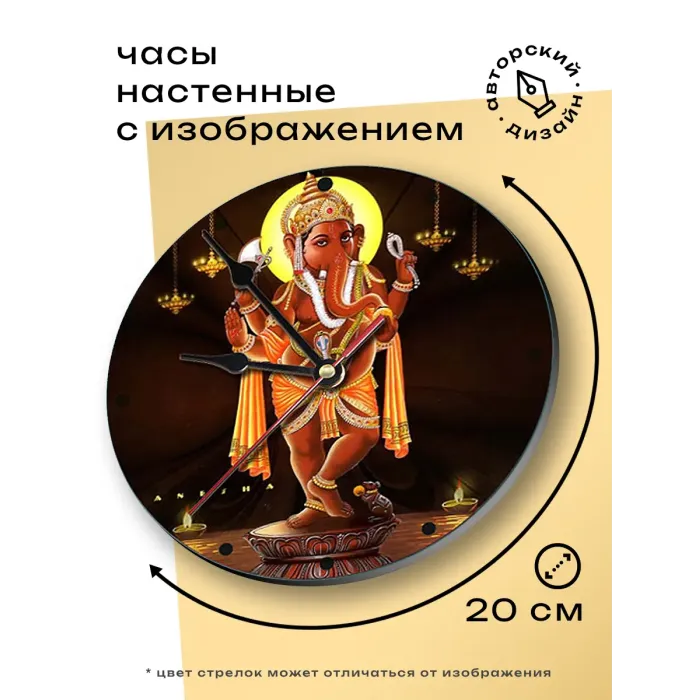 Настенные часы с изображением Ганеши. Изготовлены из вспененного пластика ПВХ, имеют круглую форму и открытый циферблат.