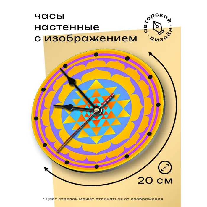 Настенные часы Шри-янтра — это не просто функциональный предмет, а символ гармонии и баланса. Эти круглые часы диаметром 20 см изготовлены из лёгкого вспененного пластика ПВХ, что делает их идеальными для любого интерьера. Яркий циферблат с изображением Шри-янтры выполнен методом наклейки, добавляя эстетическую ценность в каждую деталь.
