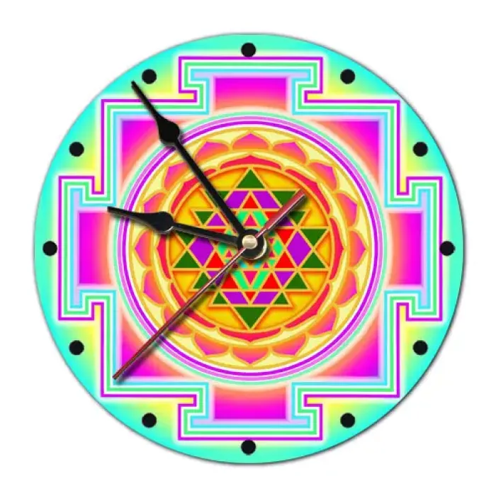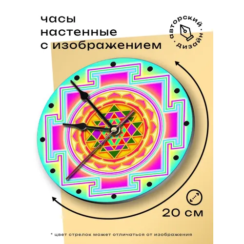 Настенные часы Шри-янтра — это стильный элемент декора, который привносит гармонию и спокойствие в любое пространство. Циферблат диаметром 20 см выполнен из лёгкого вспененного пластика ПВХ и украшен традиционным символом Шри-янтры, известным своей глубокой духовной значимостью. Основные особенности: