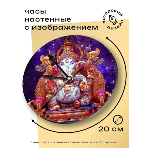 Настенные часы с изображением Ганеши — это не только функциональный предмет интерьера, но и символ удачи и благополучия. Эти круглые часы диаметром 20 см изготовлены из лёгкого вспененного пластика ПВХ, что делает их привлекательными и практичными. Открытый циферблат украшен яркой наклейкой, которая добавляет оригинальности в любой интерьер.