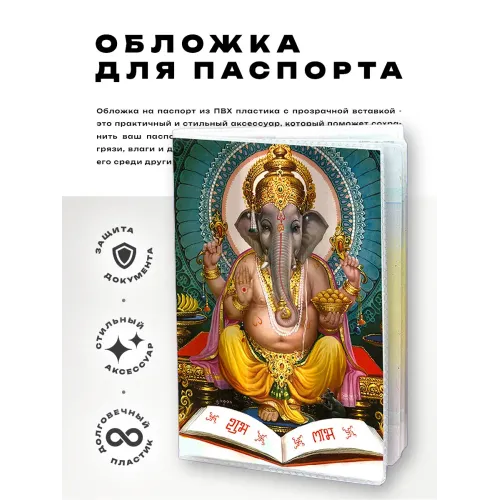 Обложка для паспорта Ганеш — это стильный и практичный аксессуар, который не только защищает документ, но и подчеркивает индивидуальность. Изготовленная из прозрачного ПВХ-пластика, она обеспечивает надежную защиту от повреждений и загрязнений. Основные особенности: