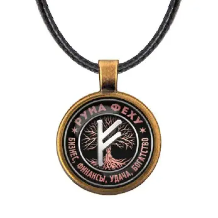 Кулон-сувенир из бижутерного сплава с покрытием под бронзу и стеклянной линзой, изображающий руну Феху.