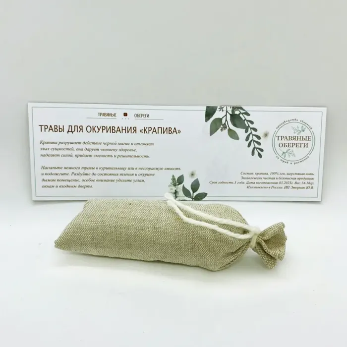 Трава для окуривания Крапива — натуральное средство, создающее атмосферу защиты и очищения. Считается, что крапива помогает разрушать негативные энергии и отгонять злых сущностей, а также наделяет смелостью и решительностью. Основные особенности: - Экологически чистый состав: 100% крапива, лён и шерстяная нить обеспечивают безопасность использования. - Традиционно используется в ритуалах очищения и защиты от негативных влияний. - Удобный вес ~15 г позволяет использовать траву как для личного применения, так и для создания уюта в доме. Советы по использованию: Для окуривания достаточно насыпать немного травы в курительницу или несгораемую ёмкость. Поджечь её, раздувая до состояния тления, чтобы дым заполнил помещение. Особое внимание следует уделить углам, окнам и входным дверям для максимального эффекта. Эта трава может стать отличным подарком или дополнением к домашнему уюту.