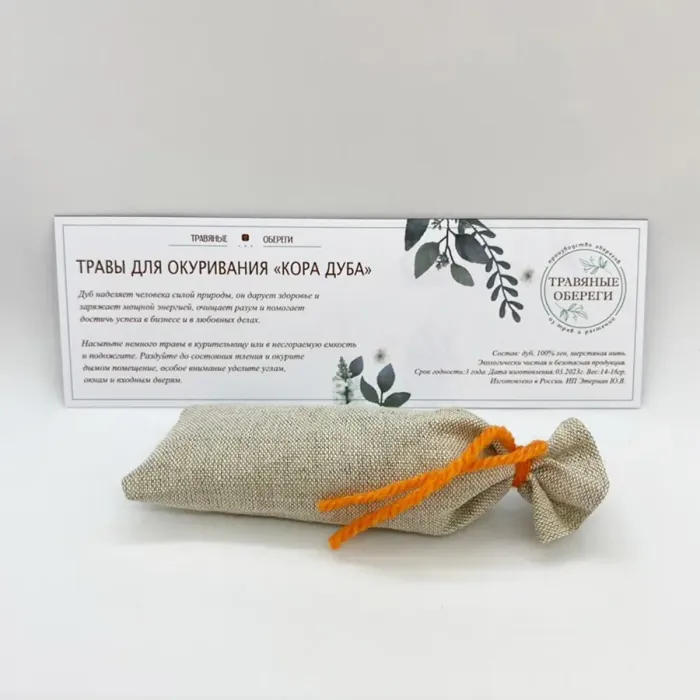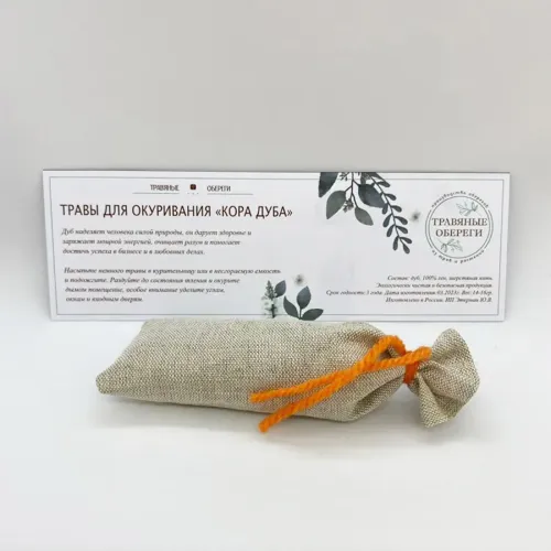 Трава для окуривания Кора Дуба — натуральный продукт, наполняющий пространство силой природы. Аромат коры дуба способствует очищению разума и помогает в достижении успеха в бизнесе и любви. Основные особенности: - Состав: 100% кора дуба, экологически чистая продукция без добавок. - Безопасность использования: изготовлено из натуральных материалов — льна и шерстяной нити. - Удобная упаковка с весом около 15 г позволяет легко использовать траву для окуривания в любых условиях. - Срок годности составляет 3 года, что гарантирует долгосрочное хранение без потери качества. Советы по использованию: достаточно насыпать немного коры дуба в курительницу или несгораемую ёмкость, поджечь и раздувать до состояния тления, уделяя внимание углам и входным дверям для максимального эффекта очищения. Кора дуба традиционно используется как символ силы и защиты, что делает этот продукт отличным подарком или элементом уютной атмосферы дома.