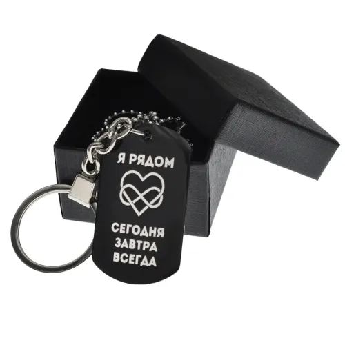 Размеры и комплектация: Размер 49х28 мм. В комплекте кольцо для ключей и шариковая цепочка.