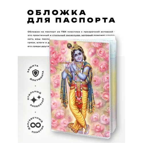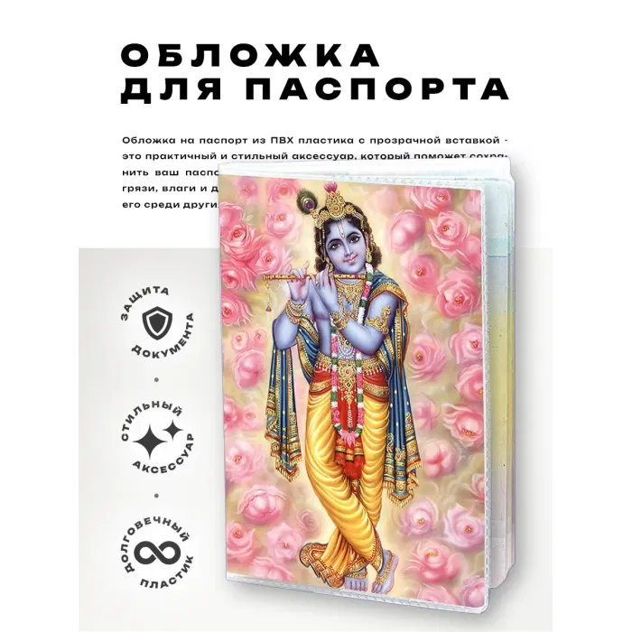 Обложка для паспорта Кришна выполнена из прозрачного ПВХ-пластика и украшена яркой полиграфической вставкой. Этот аксессуар не только защищает паспорт от повреждений, но и добавляет индивидуальности благодаря уникальному дизайну с изображением Кришны. Обе стороны обложки имеют одинаковое оформление, что делает её стильной и практичной. Упакована в удобный полипропиленовый пакет с вырубкой под еврокрючок, что позволяет легко разместить товар на витрине.