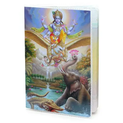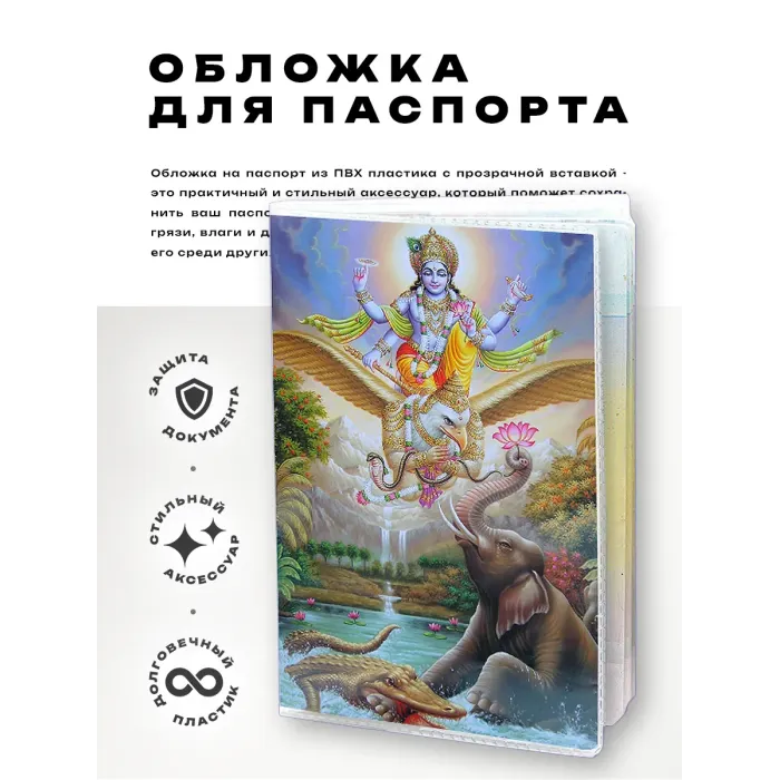 Обложка для паспорта Вишну, Гаруда, Гаджендра и Макара — это стильный аксессуар с глубоким культурным смыслом. Она выполнена из прозрачного ПВХ-пластика и украшена полиграфической вставкой с уникальным изображением на обеих сторонах. Этот продукт не только защищает паспорт от повреждений, но и придаёт ему особый шарм благодаря ярким символам восточной мифологии.