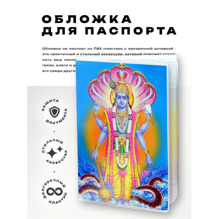 Обложка для паспорта Вишну — это стильный и практичный аксессуар, который не только защитит документ от повреждений, но и подчеркнёт индивидуальность. Изготовленная из прозрачного ПВХ-пластика, она обладает высокой прочностью и долговечностью. Основные особенности: