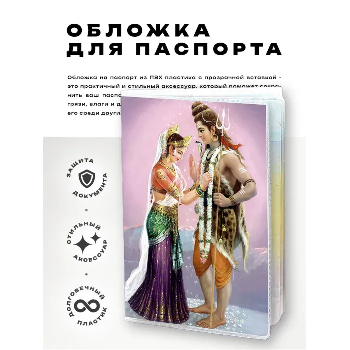 Обложка для паспорта Шива и Парвати — это стильный аксессуар, который не только защищает документ, но и отражает богатую индийскую культуру. Изготовленная из прозрачного ПВХ-пластика, она обладает высокой прочностью и долговечностью.