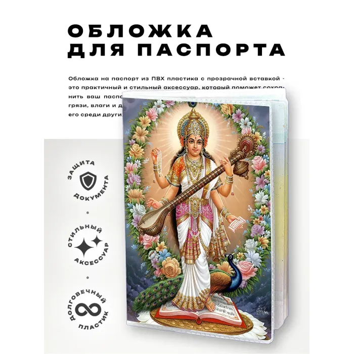Обложка для паспорта Сарасвати выполнена из прозрачного ПВХ-пластика и станет стильным аксессуаром для каждого путешественника. Эта обложка не только защищает паспорт от повреждений, но и придаёт ему уникальность благодаря полиграфической вставке с изображением на обеих сторонах.