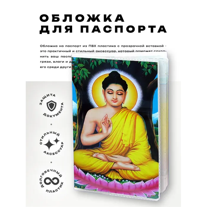 Обложка для паспорта Будда выполнена из прозрачного ПВХ-пластика и украшена полиграфической вставкой, что придает ей уникальный стиль. Эта обложка не только защищает паспорт от повреждений, но и демонстрирует символику буддизма, которая ценится за свою гармонию и спокойствие. Обе стороны обложки имеют одинаковое изображение, что делает её симметричной и привлекательной. Упакована в удобный полипропиленовый пакет с вырубкой под еврокрючок, что упрощает хранение и транспортировку.