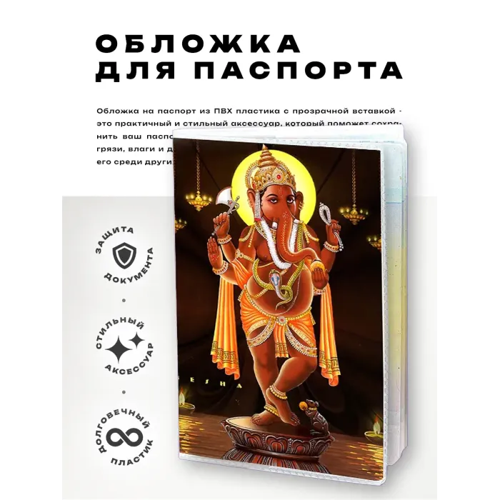 Обложка для паспорта Ганеша — это стильный и практичный аксессуар, который не только защищает документ, но и отражает богатую индийскую культуру. Изготовленная из прозрачного ПВХ-пластика, она обладает высокой прочностью и долговечностью.